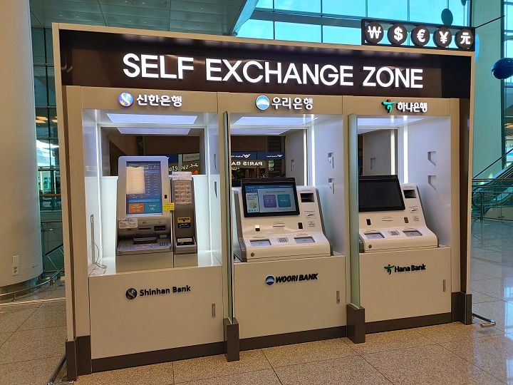 首尔市内的汇率会高于机场,如果不急用可以到达首尔市内之后再兑换。如果急需现金,可以在机场内的银行窗口或自助换汇机兑换,也可以使用ATM直接提现。一层入境口B方向的韩亚银行24小时营业,其他换钱所营业时间各异,基本到21:00或23:00左右。