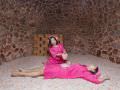 进入高温松火汗蒸幕之前,我们选择了“难度系数”较低的盐巴房进行热身。盐巴房温度大约有50℃,墙面与地面都镶嵌和堆满的白色“石头”其实是货真价实的盐哦!这里的温度不算高,直接躺在花白的盐石之上也不会觉得烫。女士们可将温热的盐石放在小腹部,对于改善女性痛经、体寒等均有不错的功效!