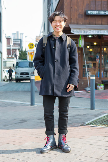 Ha-eun是一位年轻的饶舌歌手,并且经常会在弘大进行一些表演。今天Ha-eun来到弘大却不是因为演出,而是专程来和女朋友约会的。手腕上的“阿玛尼”手表很洋气,那双深蓝色短靴最近在韩国很流行哦。它平时喜欢在网上购物,或去旧货市场淘宝。最喜欢的品牌为“POLO”、“Heel Bruise”等。