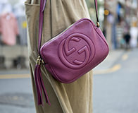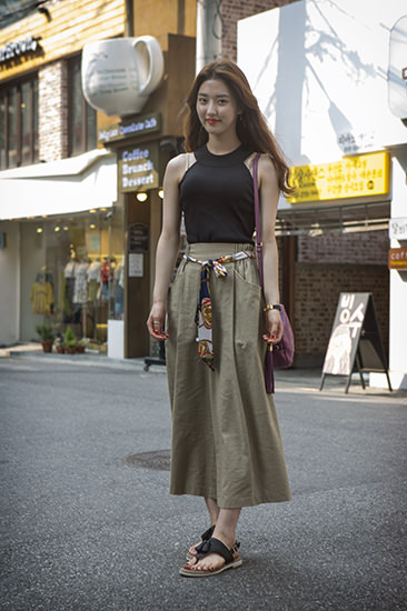 常去弘大购物的Su-ji,穿着卡其色高腰裤搭配黑色背心,给人一种静谧平和的氛围。在东大门买的围巾系在腰上成为了整体穿着的亮点。而她肩上背着古驰的勃艮第色包包则流露出一股成熟风格。Su-ji特别喜欢去弘大逛街和购物,连她脚上穿的凉鞋都是在弘大买的。