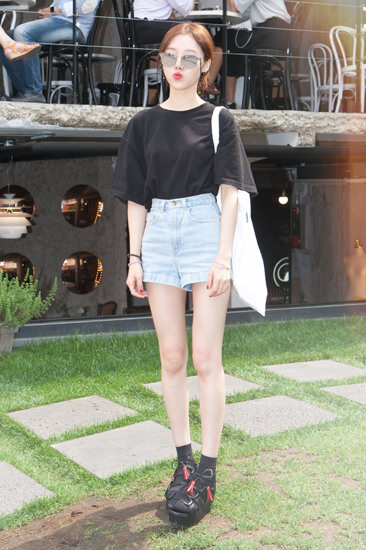 远从全州来到首尔旅游的Yeong-hun,他今天上半身黑色衬衫搭配下半身丹宁短裤的打扮,给人一种特别清凉爽快的感觉。而他戴得太阳眼镜则是在网店上购买。 Yeong-hun表示,他今天来首尔除了来林荫道走走,还特别去了明洞和汉南洞逛逛。