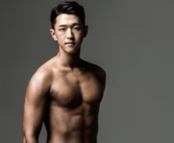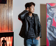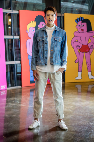 以骑士夹克搭配乞丐牛仔裤的 Hui-jung,硬朗风十足。平时他比较喜欢简单的内搭。最近他经常去逛“H&M”和 “COS”等品牌商店。每周五次以上的训练和足球运动,让他的腹肌不输给其他任何成员。