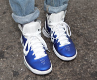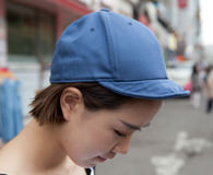 来弘大附近买日记本的Su-hyeon,今天的搭配可是街头范儿十足。脚下宝石蓝色的耐克高帮运动鞋与购于“A LAND”的最新款“Mister G”系列鸭舌帽带出自由张扬的气息,露脐T恤与复古的牛仔裤也被演绎出不同的味道。