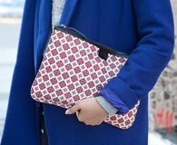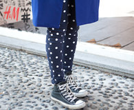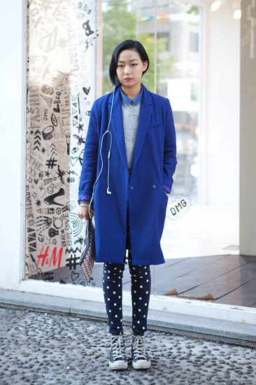 Ji-hee一出现在街口便瞬间吸引了小编的目光,没想到眼前的她还只是高中生!蓝色长款大衣外套配深蓝色圆点裤子和同色系的帆布鞋,拉长的眼线和深色的口红把复古演绎得淋漓尽致。购于STYLE NANDA的红色花纹手包将视线集中,巧妙地中和了整体的冷色调。