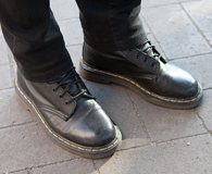 趁下午阳光尚好来弘大逛街约会的两人,看上去是不是很配呢?皮肤白皙的Seo-ryung(左)以深色牛仔上衣搭配黑色的百褶裙,脚下的平底鞋显得很舒适。红色的包包购于lapalette。男友Gi-hyun(右)则有点学术男的气质,脚下的皮鞋是“Dr. Marten”的品牌。