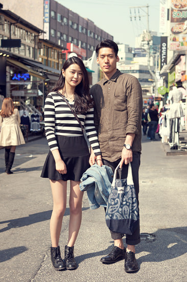 趁着正午的好天气来弘大吃饭逛街的Hye-ri(左)和Jeon-un(右),Hye-ri穿黑白条纹的连衣短裙搭配短靴,精致的耳钉在发际中若隐若现;男友则是素人的卡其色衬衣和9分休闲裤,加上今年最潮的复古发型,更增添了时尚的味道。
