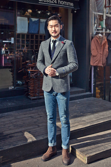 Se-jeong留着腮胡却很友善,笑起来像个小孩子。他是弘大“dress24 homme”绅士服装店的职员,几乎每天都会穿着一身绅士服。红色蝴蝶结顽皮可爱,布带手表休闲大方,令这一身服饰看起来又没那么庄重。喜欢他的穿衣打扮吗?就到这家店逛一逛吧!