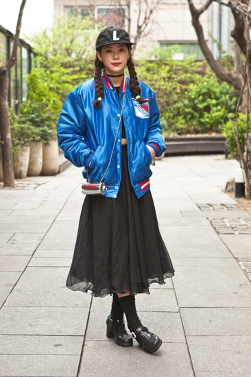 可爱的Ae-ri是一名大学生,扎了两个辫子看起来更甜美了。她说自己平时很喜欢与众不同的穿搭,林荫道是最经常逛的一条街。见到她时手上还拿着一个“FOREVER 21”的购物袋。“Coke”标志的斜挎小包和蓝色棒球衣都在国外购买。