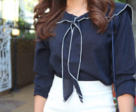 留着大波浪卷的Su-Jin有种高冷的气质,深蓝色上衣的蝴蝶结是今天搭配的亮点,更添一分妩媚。白色的高腰短裙让大白腿更显修长,干净利落的蓝白配,加上手尖上闪亮的嫣红美甲,通体很时尚。Su-Jin来自首都圈安养市,平常爱在百货店购物,喜欢的品牌有“Plastic Island”。