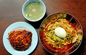 豆浆面是韩国夏天的一道风景线 韩巢小编由于不太喜欢喝豆浆,因此也不太喜欢豆浆面,但“晋州家”的豆浆面味道堪称一绝。在韩国,豆浆面就如同中国的绿豆汤一样,是夏天的一道风景线。如果您夏天来到韩国,请一定尝尝豆浆面。另外,在首尔市厅站附近还有一家兄弟店——“晋州会馆”,店主为“晋州家”创始人的弟弟。 |