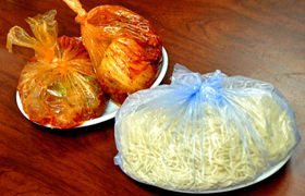 还有客人将面条打包回家 小编的采访时间为下午三点到四点,是一天中最闲的时候,但是这里的客人依旧络绎不绝,采访不断被打断。其中竟然还有客人将面条打包回家。由于没有专用打包餐具,面条、汤汁及包卷泡菜被分别装在塑料袋里。据店内工作人员介绍,“有时也会有这样的狂热粉丝”。 ※鸡肉刀切面不可外带。 |