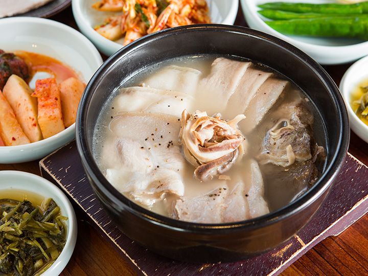 “严龙白猪肉汤饭”是釜山人气猪肉汤饭美食店,2019年夏天在首尔仁寺洞一带开了“钟阁”分店。本店的猪肉汤饭有“釜山式”、“密阳式”两种,二者均是庆尚道猪肉汤饭的代表,却风味迥异,各有特色。“釜山式”用猪肉熬的汤底清淡透亮,除了猪肉、米饭以外没有多余的浇头,吃的时候可以与入味的韭菜泡菜同吃。“釜山式”汤饭分为普通与特别两种,“特别”含有五种不同部位的猪肉,不仅丰盛而且口感卓越,美味无比!“密阳式”用猪骨熬出的汤则浓厚香醇,浓汤上洒满韭菜葱段,吃的时候配以碎辣椒,风味独特。经韩屋改造过“钟阁店”餐厅分外古雅,有围墙、庭园、翠竹,缔造出一种现代化的“朝鲜酒幕”氛围,还有适合1人就餐的吧台位。