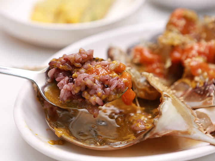 让酱蟹美味的隐藏主角便是蟹膏。由于蟹膏和米饭和着吃特别对味,因此也有个“饭小偷”的别名。将米饭放在蟹壳上与蟹膏混合后,就能品尝香浓绵密的好味道。