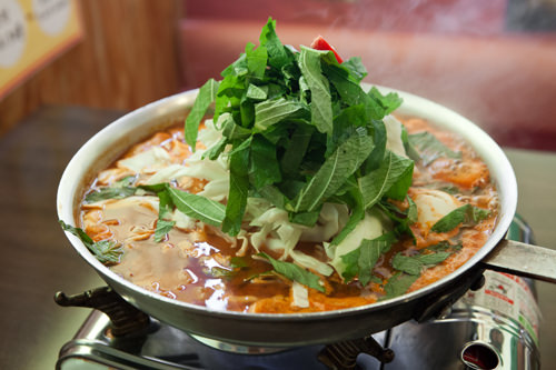 小年糕们漂浮在红通通的汤水里,还有已经煮好的鸡蛋、烤好的鱼饼串、筋面、拉面、卷心菜、苏子叶等等。将已经煮好的食材放在深深的铝制锅里端上来,等待30秒后即可食用。因为拉面类如果不即时食用很容易粘锅,所以老板建议按照筋面 →拉面 →鱼饼串 →年糕 →蔬菜 →鸡蛋的顺序食用。如果吃到一半觉得根本不够,吃货们先不要抓狂,咱可以加点钱追加食材哦!