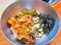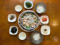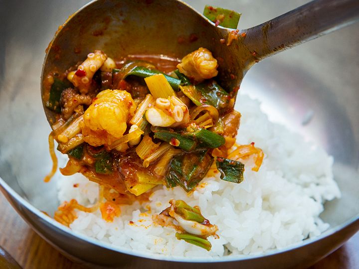 每点一份辣炒章鱼,就会附带一碗米饭。最美味的吃法就是把炒熟的章鱼、鲜虾和肥肠浇在米饭上后,放入一些拌韭菜和紫菜,最后将这些搅拌均匀后就可以啦!这道菜的口味微微辣,如果喜欢吃超辣味,就可以往这碗米饭上多浇一些辣汤。如果觉得不够吃,最后还可以在锅里煮个乌冬或拉面。