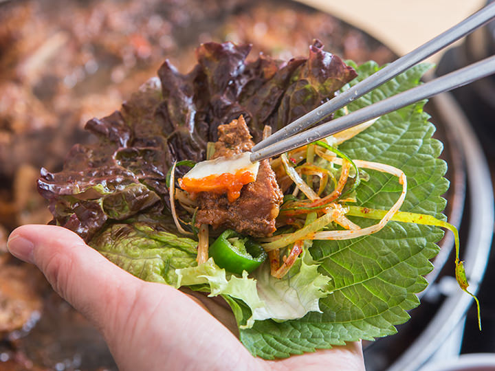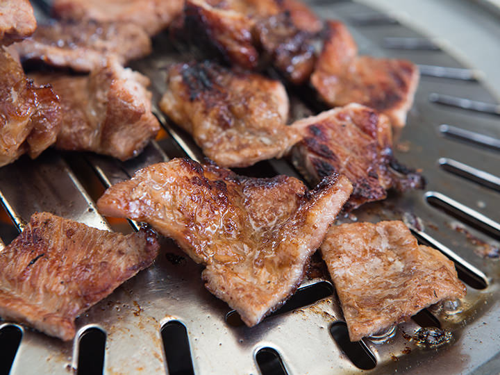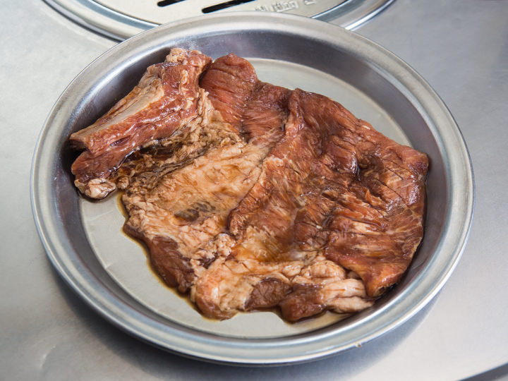 “烤猪排”是将五花肉连骨切下,用以酱油调制的酱料进行腌制,然后在铁板或钢网上烧烤。因为酱汁已经完全浸透在猪排里,所以烤出来以后的肉质柔软得仿佛快要融化了一般。再加上价格比烤牛排实惠许多,所以一直以来深受大众喜爱。