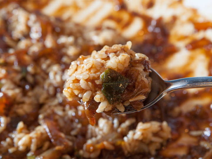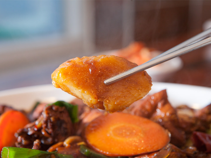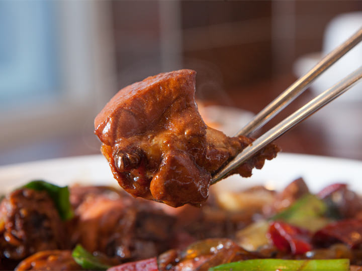 大块的鸡肉、土豆、粉条,再加上大量辣椒,放入酱油和砂糖等调料,加火炖煮,“炖鸡”就完成了。由于份量比较大,一般一盘(一只鸡)适合两人以上一起享用。虽然每家店可能会有些差异,但一般来说,小份的适合2人内,中份的适合2~3人,大份的适合3~4人享用。味道辣乎乎的,喜欢吃辣的朋友一定不要错过哦。鸡肉和蔬菜上沾有褐色勾芡酱,是一道完美的下饭菜。