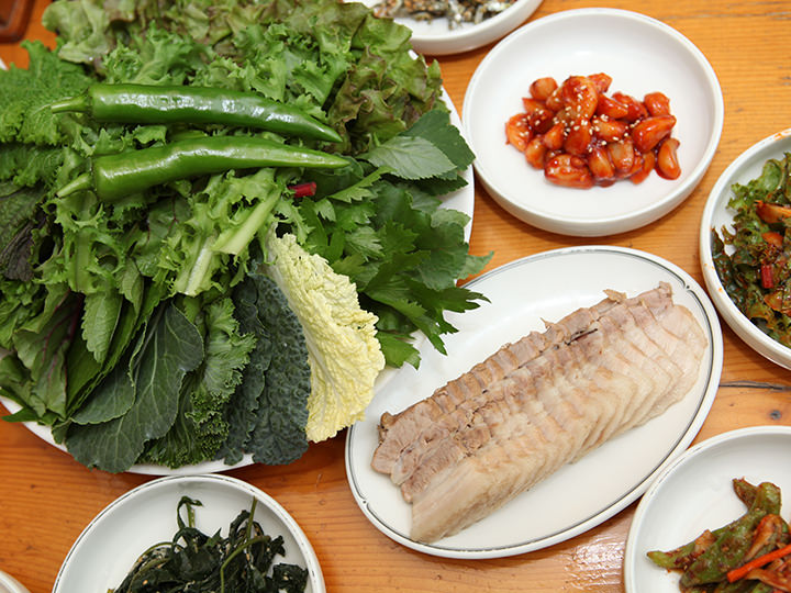 在韩国,“菜包饭”指的是用不同种类的蔬菜叶包着米饭、小菜、肉等一起吃的韩国料理。绿油油的新鲜蔬菜和一桌子各式各样的小菜并列摆在一起,只看起来就让人大饱眼福。在注重养生的韩国,菜包饭是一道非常受欢迎的健康料理。