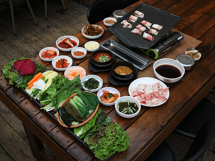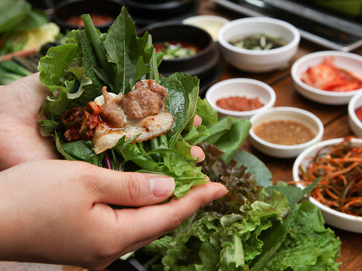 韩国烤肉店里包肉用的蔬菜主要用的也是生菜和苏子叶。用蔬菜包着蘸酱的肉、葱丝、大蒜等一口吃下去美味无比。烤肉店的蔬菜一般都可以无限续添,需要的时候跟店员讲即可。韩国烤肉之所以受大家的喜爱,最大的原因就在于是用蔬菜包着吃,美味又健康。 | ||||||