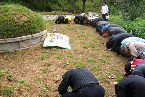 陪祭将祭酒放在桌上,祭主行2次半拜礼。随后参礼者行礼