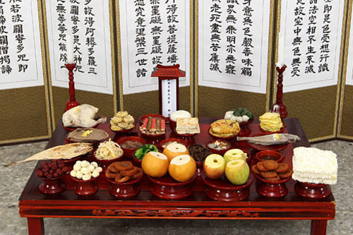 摆放水果和干果等。由西向东,按照“枣栗梨柿”的顺序,依次摆放大枣、板栗、甜梨和柿饼。这四种果实也是茶礼的必备之物。若添加其他供品,则遵循“红东白西”的原则,将红果放于东侧,白果放于西侧。苹果和梨应去头摆放。中间摆放韩式药果和香炸糯米果。