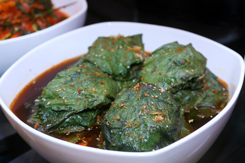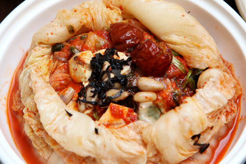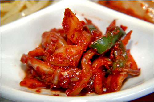 来韩国的游客很喜欢买这道小菜。咯吱咯吱有嚼劲的生鱿鱼搭配甜甜辣辣的chili酱料,口感非常特别。搭配粥或者白米饭都很美味,作为下酒菜也常常出现。虽然被叫做泡菜,但其实不是真正的泡菜,而是属于鱼虾酱一类。