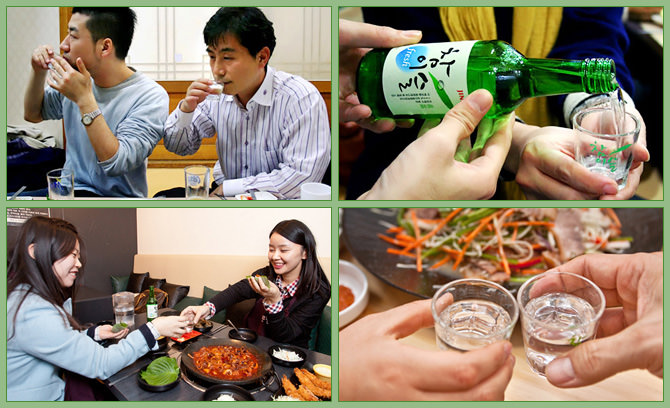韩国有着深厚的饮酒文化,朋友、闺蜜、同事之间经常用酒来增加气氛、舒缓压力、调节人际关系。而在酒桌上,喝酒的礼仪非常重要,一般男孩子的家庭从小就会用饮料当作酒来教育酒桌礼仪,这在人气亲子节目《超人回来了》中也出现过哦。那么,跟韩国人喝酒时,应该注意哪些礼仪呢?首先,年长者人给自己斟酒时,一定要用双手举杯接受;然后在这些人面前喝酒时,需要将身子侧向一旁,并用手挡住酒杯喝下。其次,年长者经常会把自己的酒杯递给你,斟上酒让你喝,也许你会觉得不卫生,但这是友好的表现,人们一般会侧过身子把这杯酒干脆地喝完以示尊敬。再次,为年长者敬酒时,则需要右手拿酒瓶、左手托着瓶底或放在胸前。另外,还有个有趣的说法,就是不能自己给自己斟酒,否则坐在你对面的人会倒霉!有时喝到兴奋了,自己给自己斟酒的情况也时有发生,这时其他人则会说“遥控器”,代表是他借你的手斟酒而已。还有个有趣的习惯,就是吃烤肉喝酒时,大家会包好一块肉,干杯后马上吃下,仿佛那样会更香呢! 韩国最具代表的酒是低度的烧酒,啤酒和马格利米酒也备受欢迎。韩国人大都还喜欢“炮弹酒”,就是将各类酒混兑在一起,其中最普遍的是将烧酒和啤酒混合而成的“烧啤”,杀伤力不小。韩国人点酒和下酒菜时也很讲究,不同的酒有不同的搭档菜,就如炸鸡啤酒的经典组合。酒吧、酒馆、路边小吃摊,到处都有小饮一杯的好地方,若听到众多韩国人碰杯时发出的大叫声,也不要惊讶,是大家的酒口号,最普遍的就是“为了”,为了什么呢?情况不一哦。 |