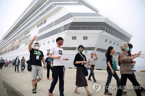 11日,大型邮轮“歌诗达赛琳娜”号(Costa Serena)抵达济州,走出船舱的游客带着口罩前往旅游目的地。在韩国旅游业受中东呼吸综合征(MERS)疫情影响的情况下,有3700多名中国游客乘坐当天抵达的游轮前往济州旅游。