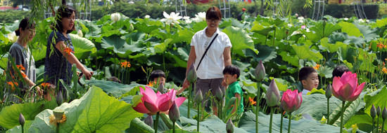 图为7月2日在忠清南道扶余宫南池,游客们正在欣赏莲花。这里是百济时的人工莲花池,每年都会有1000万朵莲花绽放,今年将于本月10~19日举行莲花庆典。