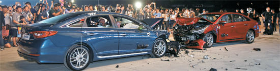 8月22日在仁川松岛现代汽车城市车道举行了汽车碰撞测试。在美国阿拉巴马工厂(右)和忠南牙山工厂生产的索纳塔2.0Turbo以56公里的时速正面疾行。这是世界上首个对大众公开的汽车碰撞测试,是现代汽车为消除“内需用的车是劣质车”的争议而特别举行的活动。实验结果是平分秋色。两辆车的安全气囊均正常启动,车门也被打开,可保证事故时安全逃生。【照片=现代汽车】