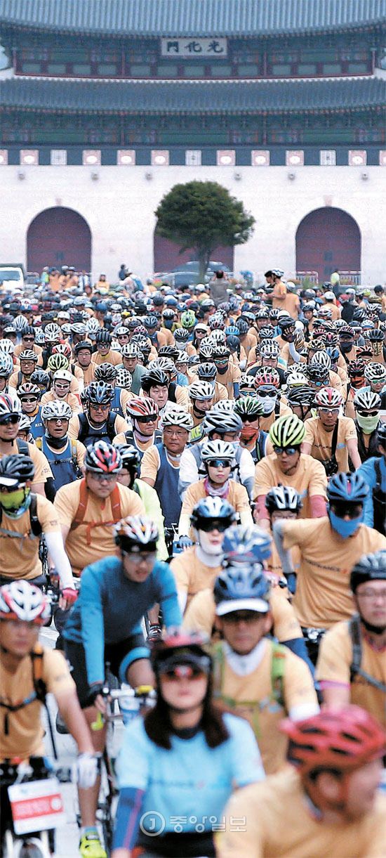 图为参加“2015你好 首尔(Hi 首尔)自行车大游行”的5000余人9月20日上午8点在首尔光化门广场出发。当天参加者们经由南大门~江边北路~加阳大桥北端骑行到世界杯公园和平广场,共21公里。各个路段在自行车通过的时间段进行交通管制。该活动由首尔市、《中央日报》、JTBC主办,Air France赞助。