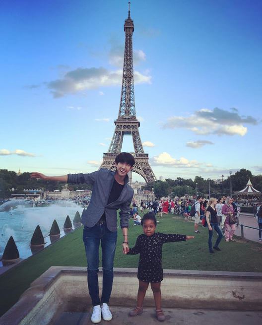 照片中光熙与一个小淑女一起站在巴黎埃菲尔铁塔前,面带灿烂笑容。特别吸引眼球的是,光熙与小女孩做出一模一样的造型,深深凝望着相机镜头。