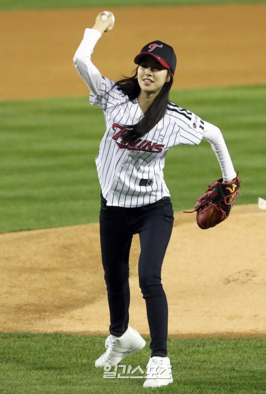 职业棒球季后赛第三场之LG对抗NC的比赛于10月24日下午在蚕室棒球场举行。图为演员陈世妍正在试球。LG球队的球迷陈世妍曾在2014年和2015年正规赛季时身穿LG队服参加过两次试球,目前陈世妍在出演MBC周末剧《狱中花》,在剧中担任女主角“玉儿”一角。