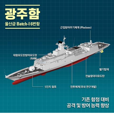 “光州号”最大航速为30节,可容纳120多人,搭载三维探测远程雷达、反舰导弹和防空导弹、反鱼雷水声对抗系统以及海上作战直升机。“光州号”将执行海上监控和防御、掌握海洋控制权、保护海上通道等任务。