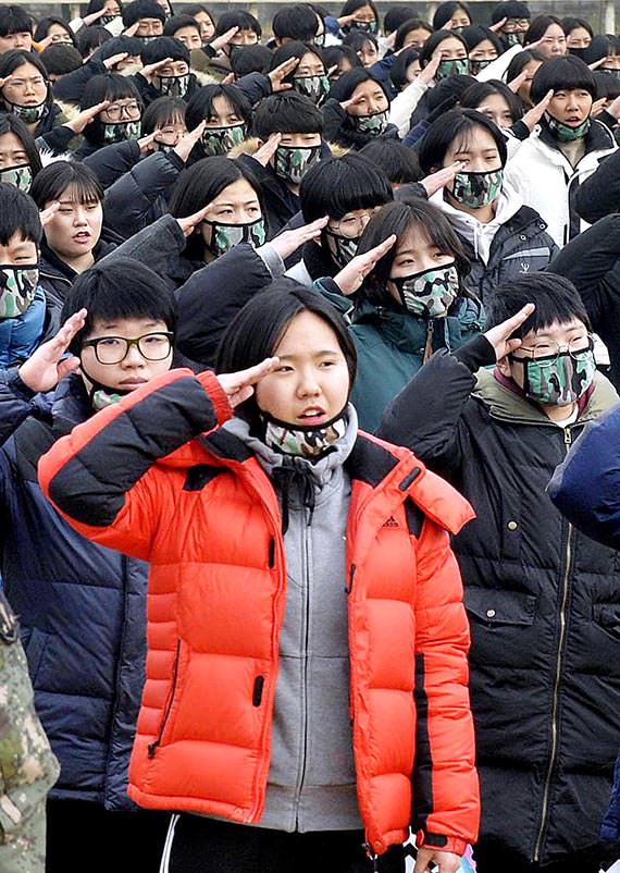 图为女军副士官预备生们1月2日在忠清南道论山陆军训练所举行的新年第一次入伍活动中向父母敬礼。当天入伍的训练兵(637人)和男女副士官预备生(1139人)将接受为期五周的射击、行军、单独战斗等基础性军事训练,熟悉军人的基本动作。