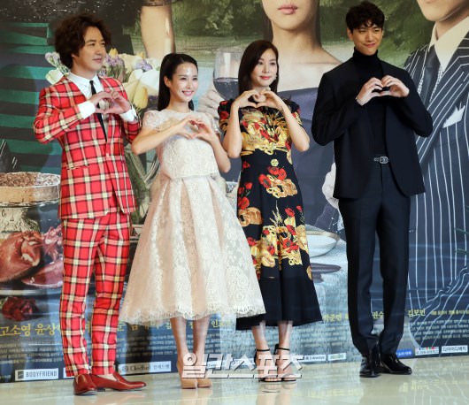 KBS2新月火剧(周一周二剧)《完美的妻子》制作发布会于2月23日下午在首尔永登浦区时代广场举行。图为尹相铉、赵如晶、高素荣、盛骏正在摆出造型接受媒体拍照。