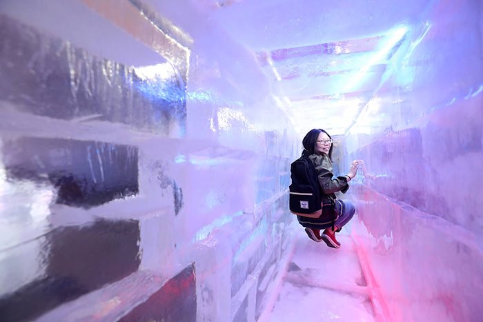 6月20日的白天最高气温达到32度,当天下午某市民来到首尔西桥洞特丽爱(Trickeye)美术馆的冰雕博物馆(Ice Museum)游玩,图为她正在经过冰洞。