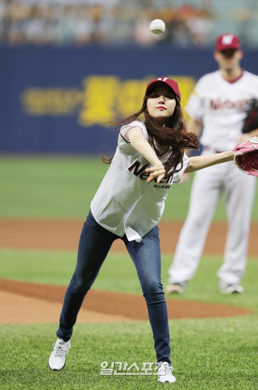 7月19日,2017职业棒球耐克森对战起亚的比赛在高尺天空巨蛋举行。图为女团PRISTIN成员ROA正在开球。
