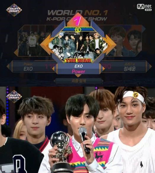 在9月14日播出的Mnet《M!COUNTDOWN》中,EXO和郑世云展开了第一名之争。郑世云凭借《JUST U》、EXO凭借《Power》成为冠军候补。