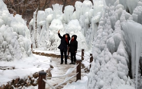 在寒潮继续肆虐的12月14日,市民们前往大田市东区上所洞森林浴场室内冰山乐园欣赏“冰雕”并拍照留念