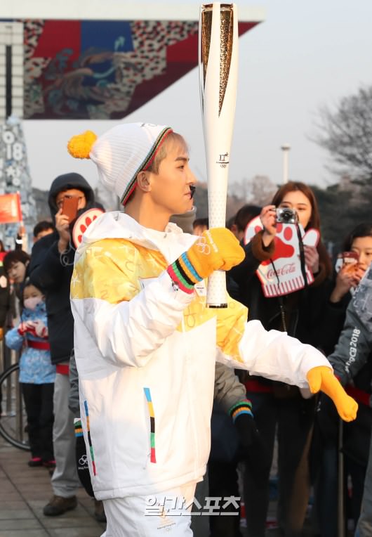 1月14日下午,2018平昌冬奥会圣火传递活动在首尔芳荑洞奥林匹克公园举行,WINNER成员宋旻浩作为火炬手参与圣火传递,图为他正在摆出造型接受媒体拍照。