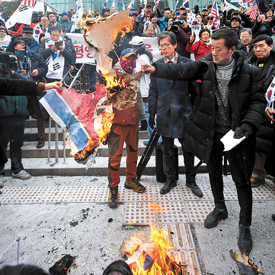 图为当日保守团体的会员们在首尔站广场焚烧朝鲜国旗。[吴宗铎 记者]