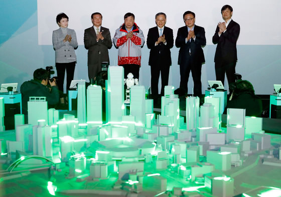 1月31日,在江原道江陵奥林匹克公园举行了一场宣告平昌冬奥会上亮相的世界最新5G示范服务完工的记者说明会。图为英特尔韩国总裁权明淑(音)、江原道副知事郑万昊、平昌冬奥会组织委员长李熙范、韩国电信公司(KT)会长黄昌圭、三星电子总裁高东真、第四次产业委员长张炳圭(音)(由左至右)正在参加纪念摄影。(图片来源:崔正东记者)