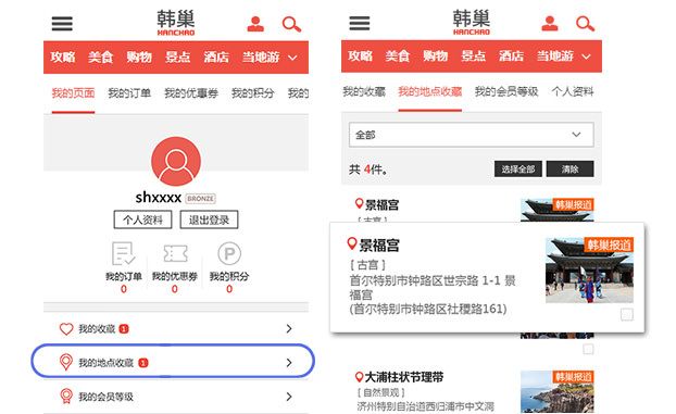 韩巢的地点收藏功能,网页和APP终于完全同步了!