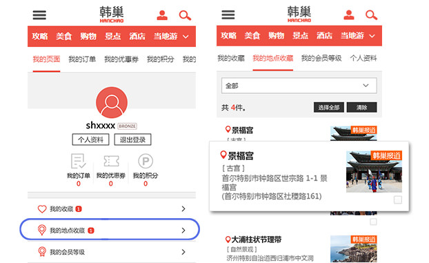 韩巢的地点收藏功能,网页和APP终于完全同步了!