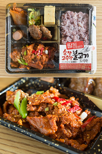 “迷你岛”便利店推出的“八道名物”将韩国各地美食做成系列盒饭,有着很高的人气。其中的“淳昌辣酱烤猪肉”盒饭(3,900韩元)香辣美味,值得一尝。
