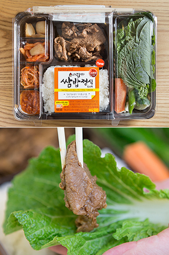 “7-11”便利店这周推出了用生菜等新鲜蔬菜包上猪肉和饭一起吃的“菜包肉饭定食”盒饭(4,500韩元)。之前并不怎么被人关注的盒饭,如今人气不断攀升,而且种类也越来越丰盛。下次来韩国旅游时,不妨也品尝一下哦。