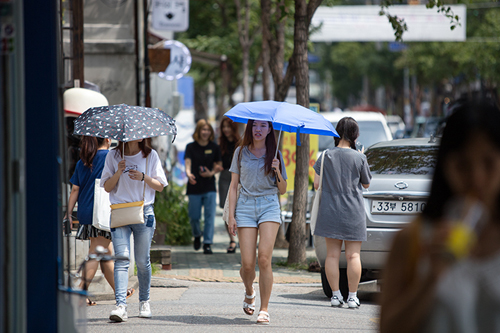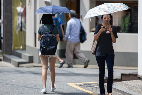近日首尔的气温升至将近30度,烈日当头,大街上使用遮阳伞的年轻女性越来越多,成为首尔街头的一道别样风景。