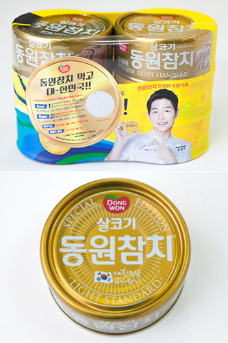 由《太阳的后裔》主演宋仲基代言的“东源金枪鱼(DONGWON)”也换上金衣为奥运呐喊喝彩。新推出的“大韩民国加油特别版金枪鱼罐头”(9,900韩元/6盒,150g/盒)金色的瓶身让人联想到金牌,寄予着韩国在本次奥运会夺金的愿望!