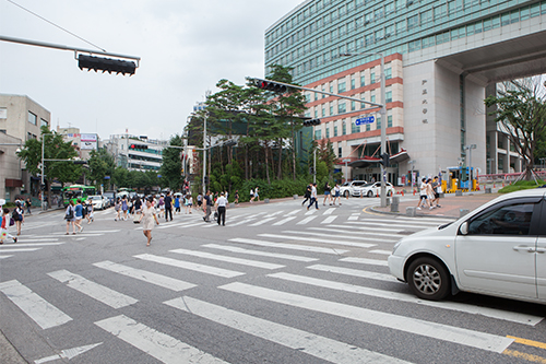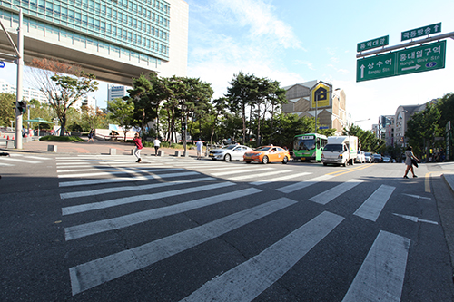 一是在弘益大学正门口的大十字路口,在既有的人行横道上,添加了对角线人行横道。这么一来,为目的地是对角的人们省去了许多等候红绿灯的时间。